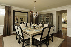 Dining tables, chairs, tableware, placemats, centerpieces, and lighting.