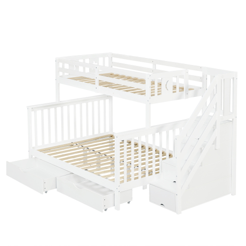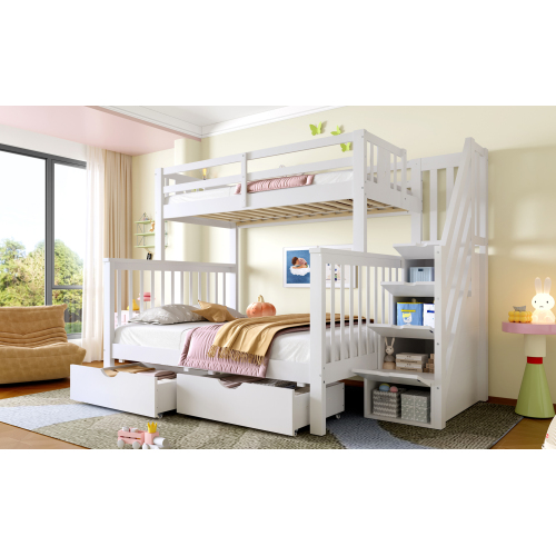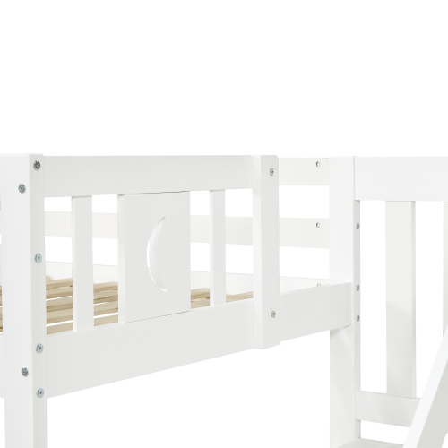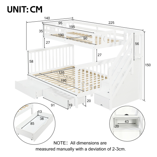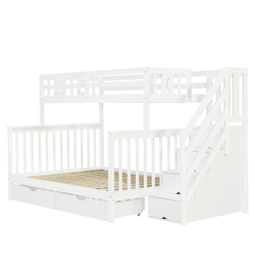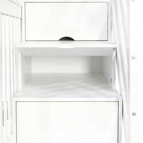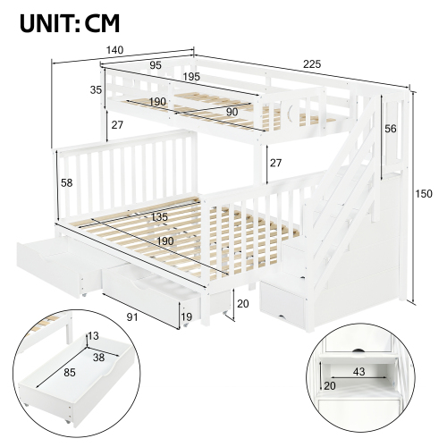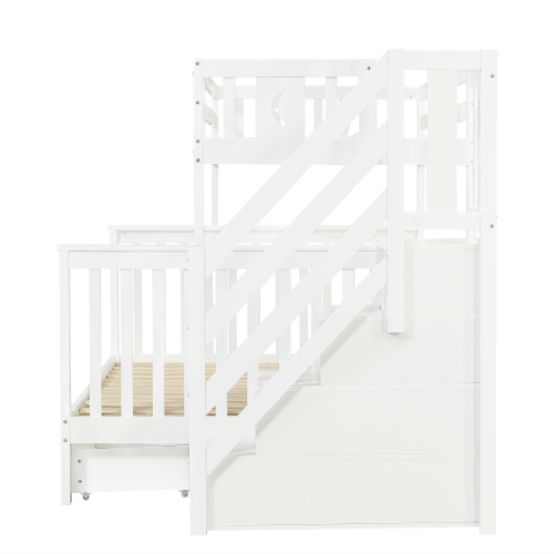 This bunk bed has ample storage space, four compartments of different sizes hide underneath the stairs and two spacious drawers under the bed are perfect for you to store quilts, bed sheets and other necessities. Combined with handrails and full-length security fence, this ensures your child can get in and out of bed safely and comfortably, enhancing security during daily use. Besides, sturdy support and tight connection further enhance stability and provide better support for the whole bed frame. The white coloured design offers a fresh, minimalist aesthetic, complemented by star and moon motifs. It blends harmoniously with any decorative style in a child's bedroom, effortlessly creating an ideal space for your. Special Features: - Drawer storage - Concealed Stairway Storage - Full-length security fence - Sturdy wood support - Stylish design with star and moon motifs