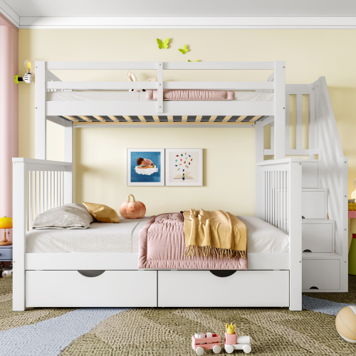 [Bunk Bed with Storage Space] Our kids Stairway bunk bed with four compartments of different sizes hide underneath the stairs are perfect for you to store quilts, bed sheets and other necessities. Two spacious drawers under the bed, you can store books and toys, making room-tidying a breeze. Slat system included, so no box spring needed